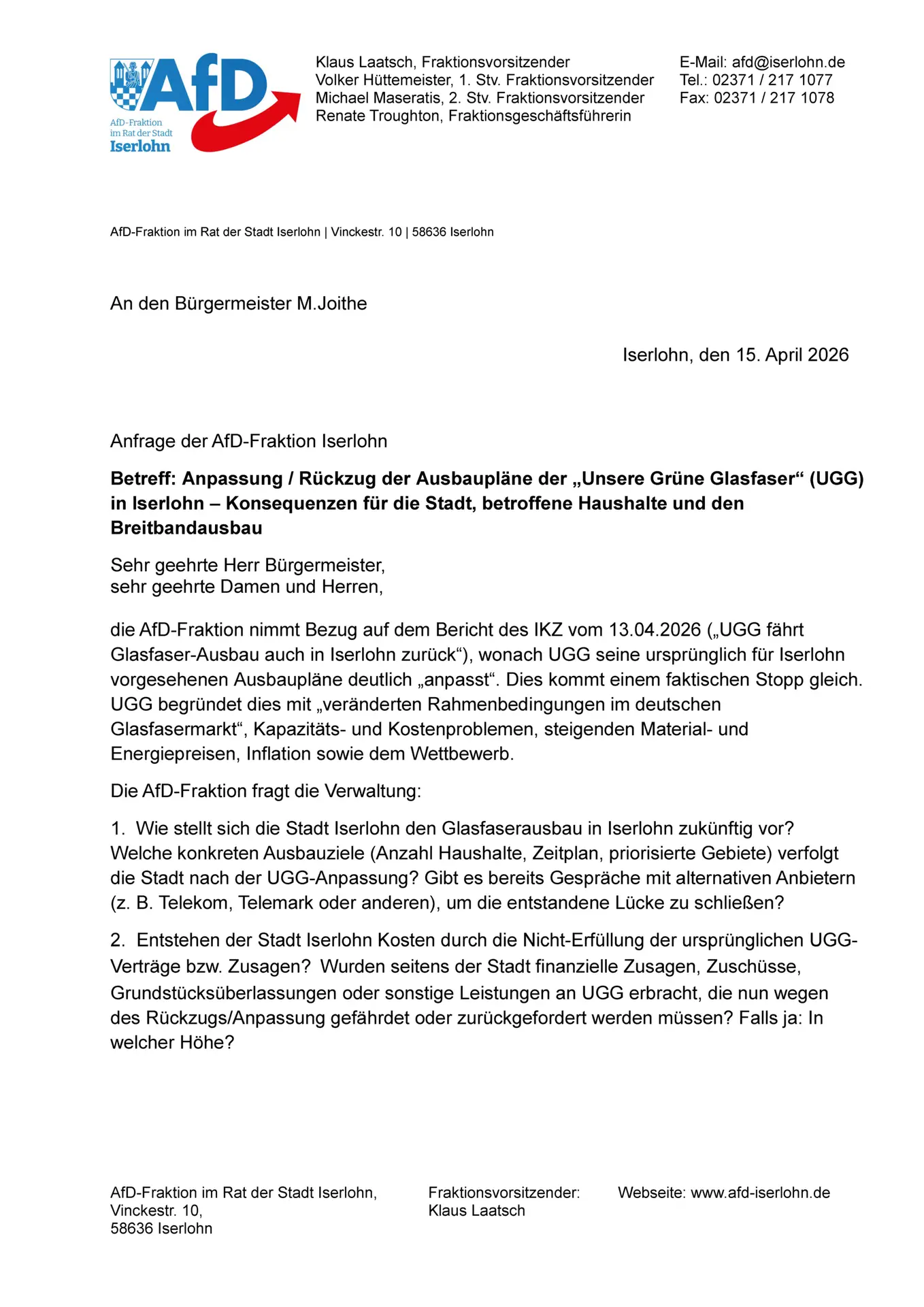 Wir thematisieren die drastische Reduzierung der Glasfaser-Ausbaupläne durch die UGG, um die künftige Breitbandstrategie und alternative Anbieter für Iserlohn zu [...]