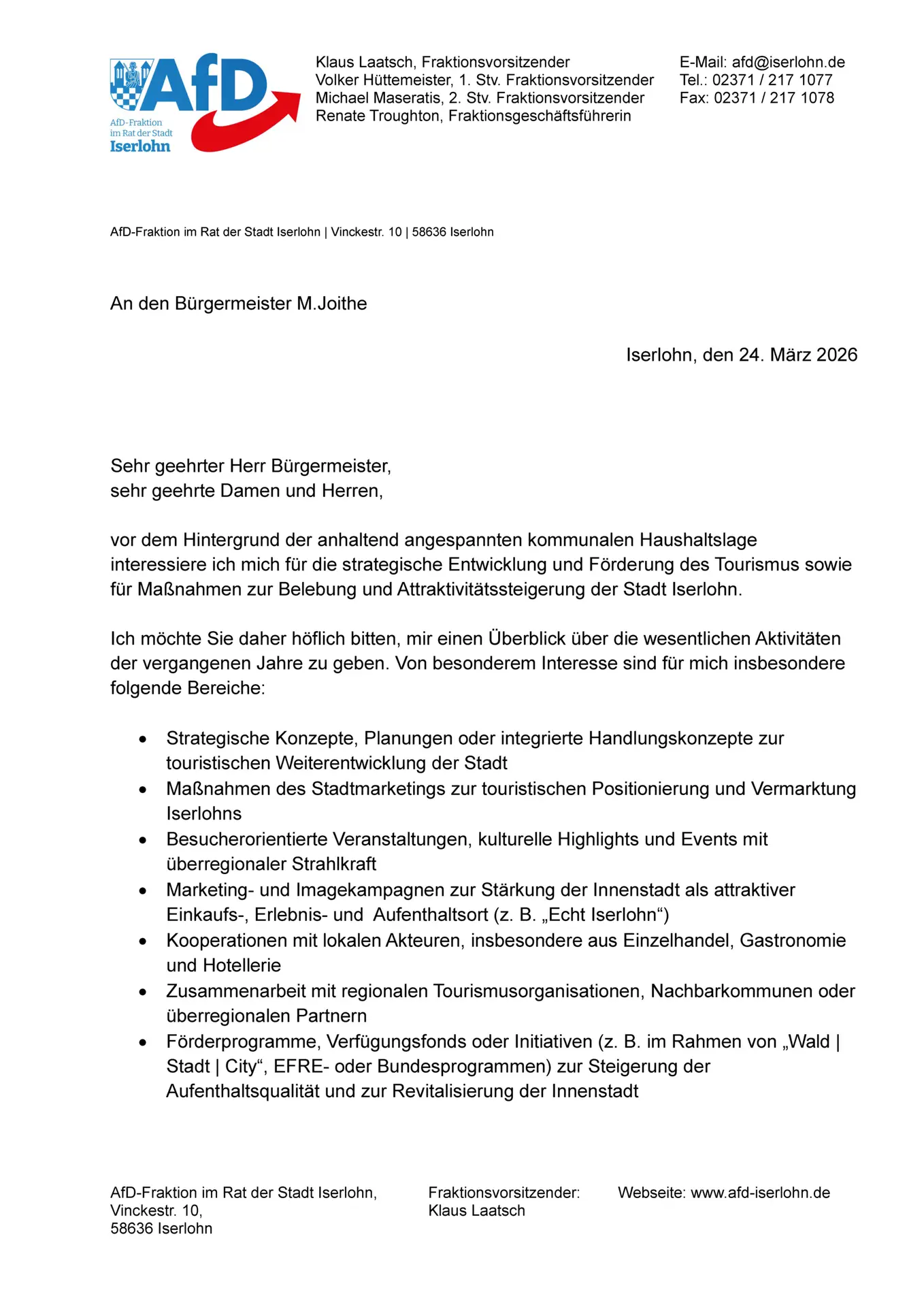 Wir erbitten angesichts der angespannten kommunalen Haushaltslage einen detaillierten Überblick über die Tourismusförderung sowie Marketing-Maßnahmen wie „Echt Iserlohn“ , um [...]