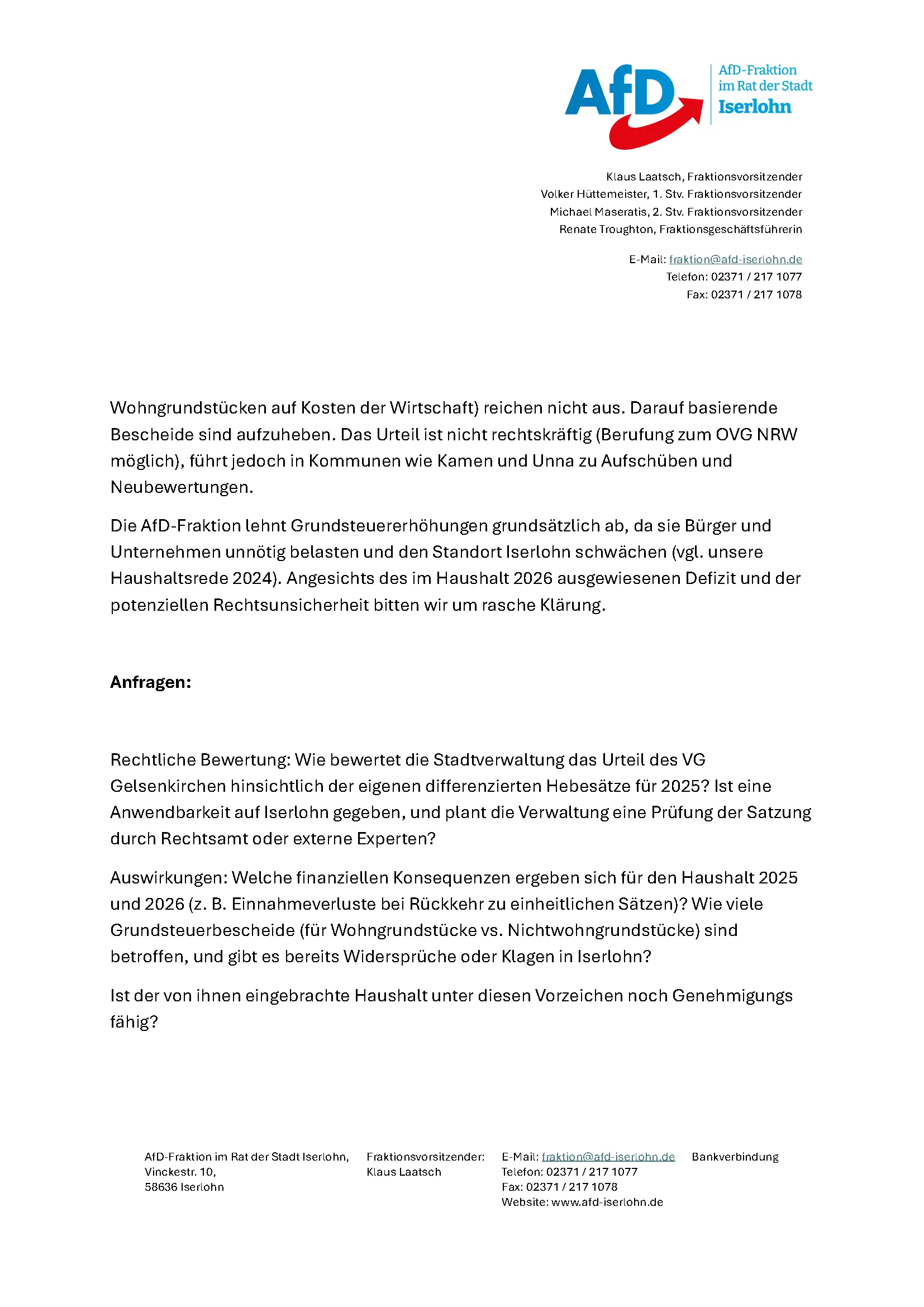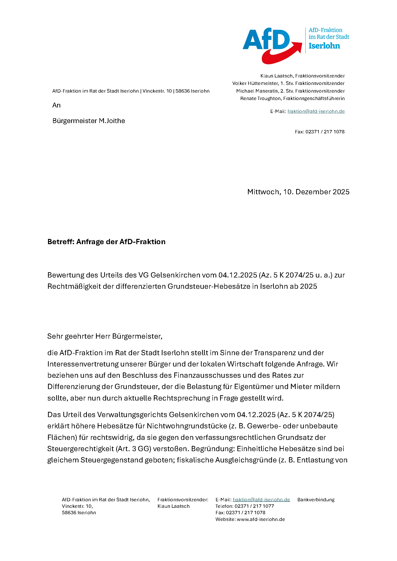 Wir fordern von der Stadtverwaltung eine umfassende rechtliche Bewertung des Urteils des VG Gelsenkirchen (Az. 5 K 2074/25), welches die differenzierten Grundsteuer-Hebesätze aufgrund von Verstößen gegen den Grundsatz der Steuergerechtigkeit nach Art. 3 GG für rechtswidrig erklärt hat. Wir verlangen Klarheit über die finanziellen Konsequenzen für die Haushalte 2025 und 2026 sowie Auskunft darüber, wie viele Iserlohner Grundsteuerbescheide von dieser potenziellen Rechtsunsicherheit betroffen sind. Unser Ziel ist der Schutz der Bürger und Unternehmen vor unnötigen Belastungen sowie die Sicherstellung eines rechtssicheren und genehmigungsfähigen Haushalts ohne Grundsteuererhöhungen.