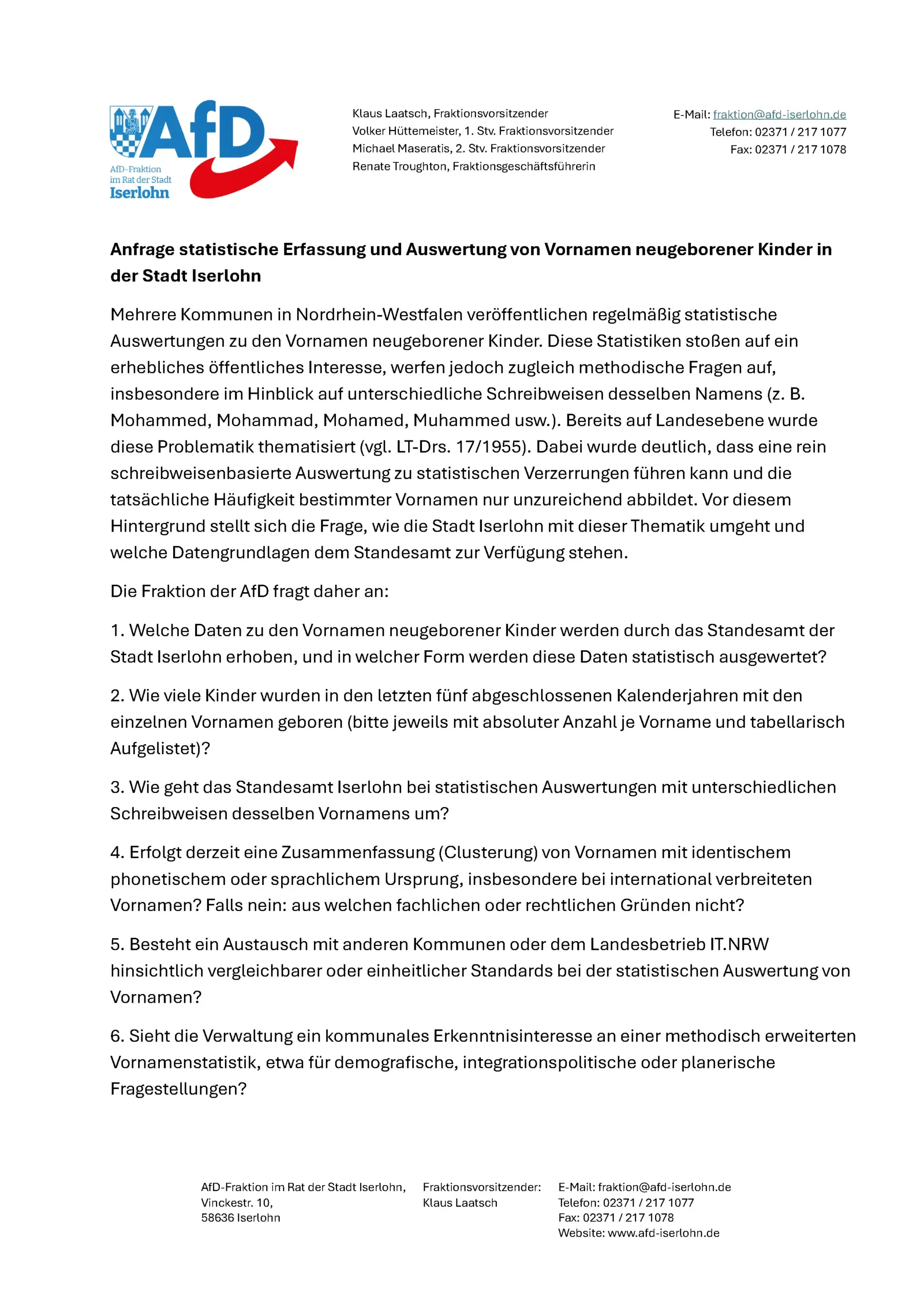Wir fordern von der Stadtverwaltung eine detaillierte Auskunft über die Erhebung und Clusterung von Vornamenstatistiken, um Verzerrungen durch unterschiedliche Schreibweisen desselben Namens (z. B. bei „Mohammed“) zu vermeiden. Durch die Abfrage der Geburtenzahlen der letzten fünf Jahre und die Prüfung methodischer Anpassungen wollen wir die Datenbasis für demografische und integrationspolitische Fragestellungen präzisieren. Unser Ziel ist es, eine transparente und fachlich fundierte Informationsgrundlage zu schaffen, die das öffentliche Interesse an einer realitätsgetreuen Abbildung der Namensverteilung in Iserlohn bedient.