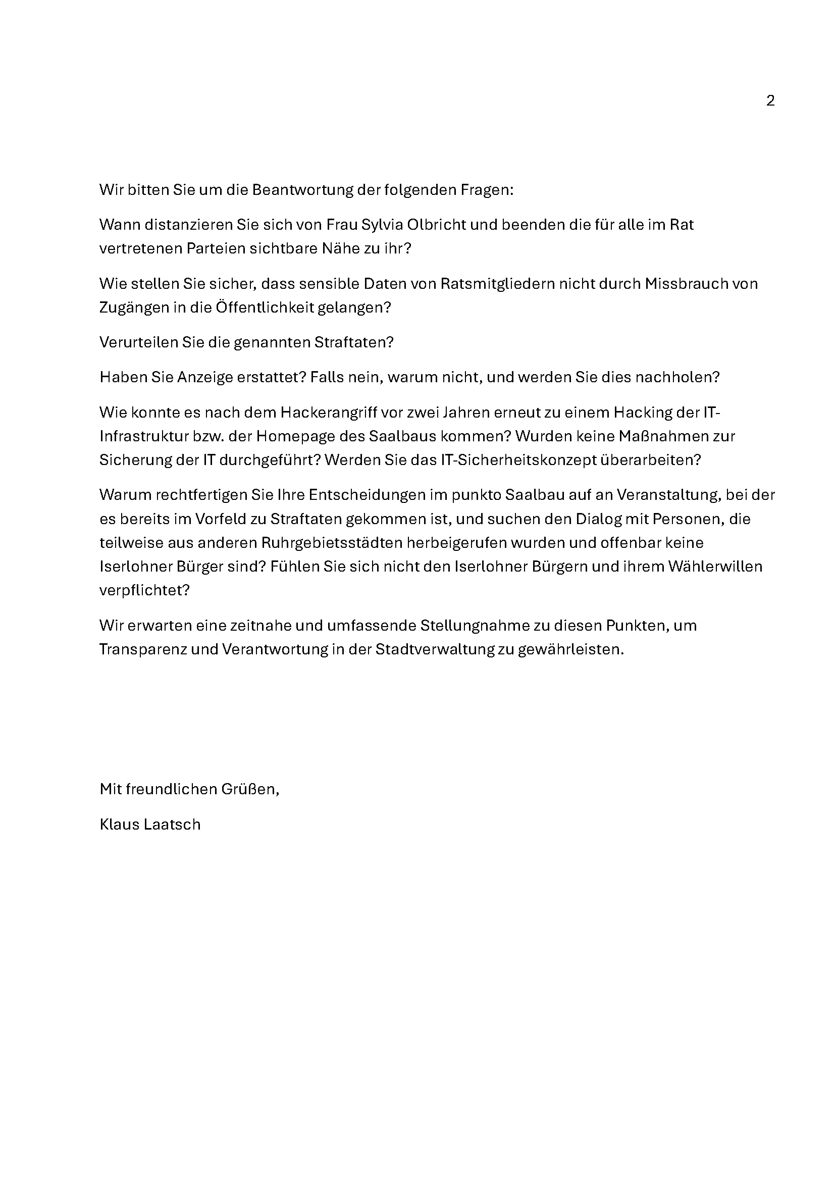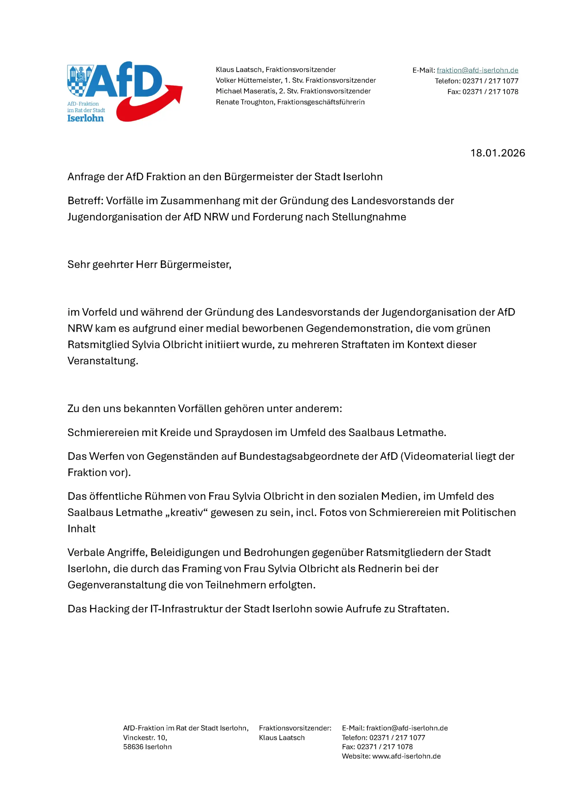 Wir fordern vom Bürgermeister eine klare Positionierung zu den Straftaten und Sicherheitsverletzungen, die sich im Umfeld der Gründung des Landesvorstands unserer Jugendorganisation ereignet haben. Angesichts von Sachbeschädigungen, tätlichen Angriffen auf Abgeordnete und einem erneuten Versagen der IT-Sicherheit verlangen wir Auskunft über eingeleitete Strafanzeigen sowie die Überarbeitung des städtischen Sicherheitskonzepts. Unser Ziel ist der Schutz unserer Mandatsträger vor politisch motivierter Gewalt und die Sicherstellung, dass sensible Ratsdaten nicht durch mangelhafte IT-Infrastrukturen gefährdet werden.