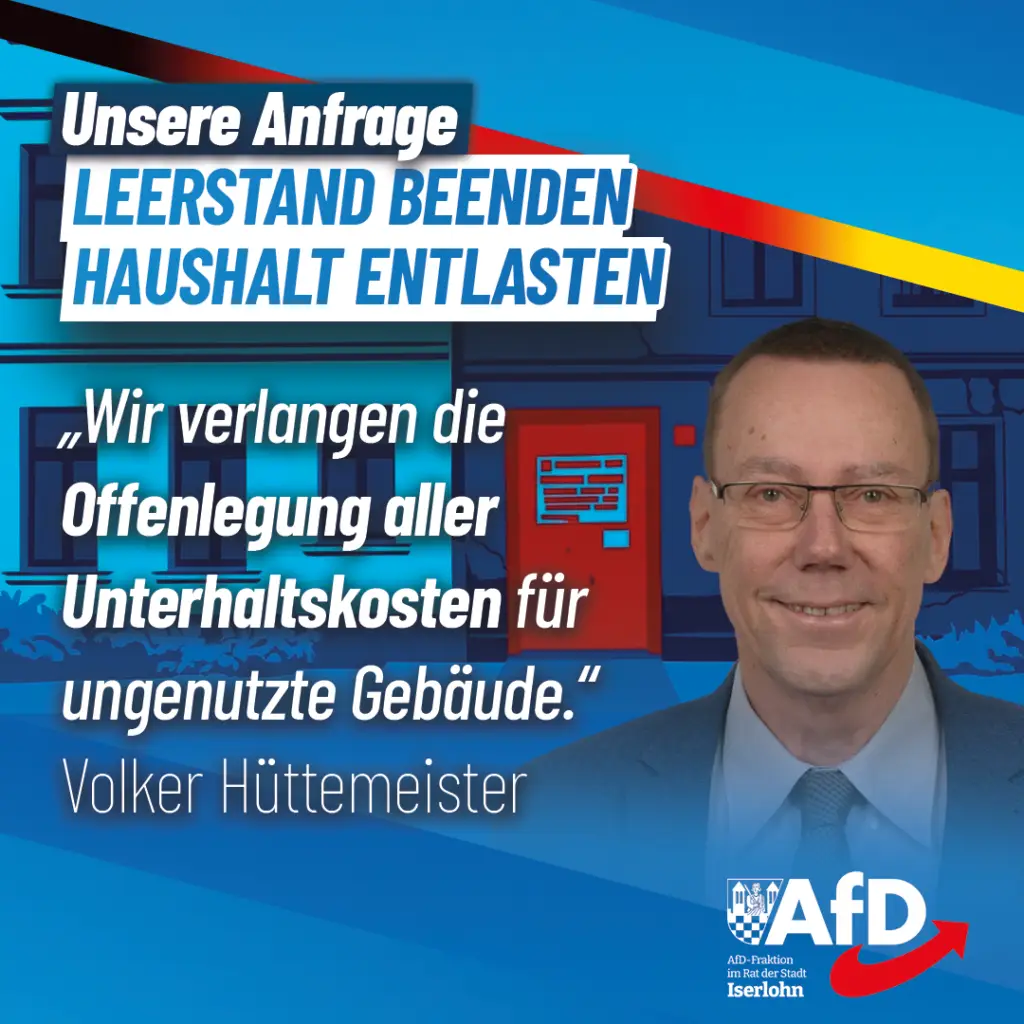Die finanzielle Lage unserer Stadt Iserlohn im Jahr 2026 ist äußerst angespannt, was die aktuellen Beratungen zum Haushaltssicherungskonzept unterstreichen. In dieser Situation ist ein effizienter Umgang mit städtischem Eigentum zwingend erforderlich. Dennoch stehen im gesamten Stadtgebiet, von Letmathe bis Hennen, stadteigene Immobilien leer, während gleichzeitig laufende Unterhaltskosten für Sicherung, Heizung und Verkehrssicherungspflicht den Haushalt belasten.
