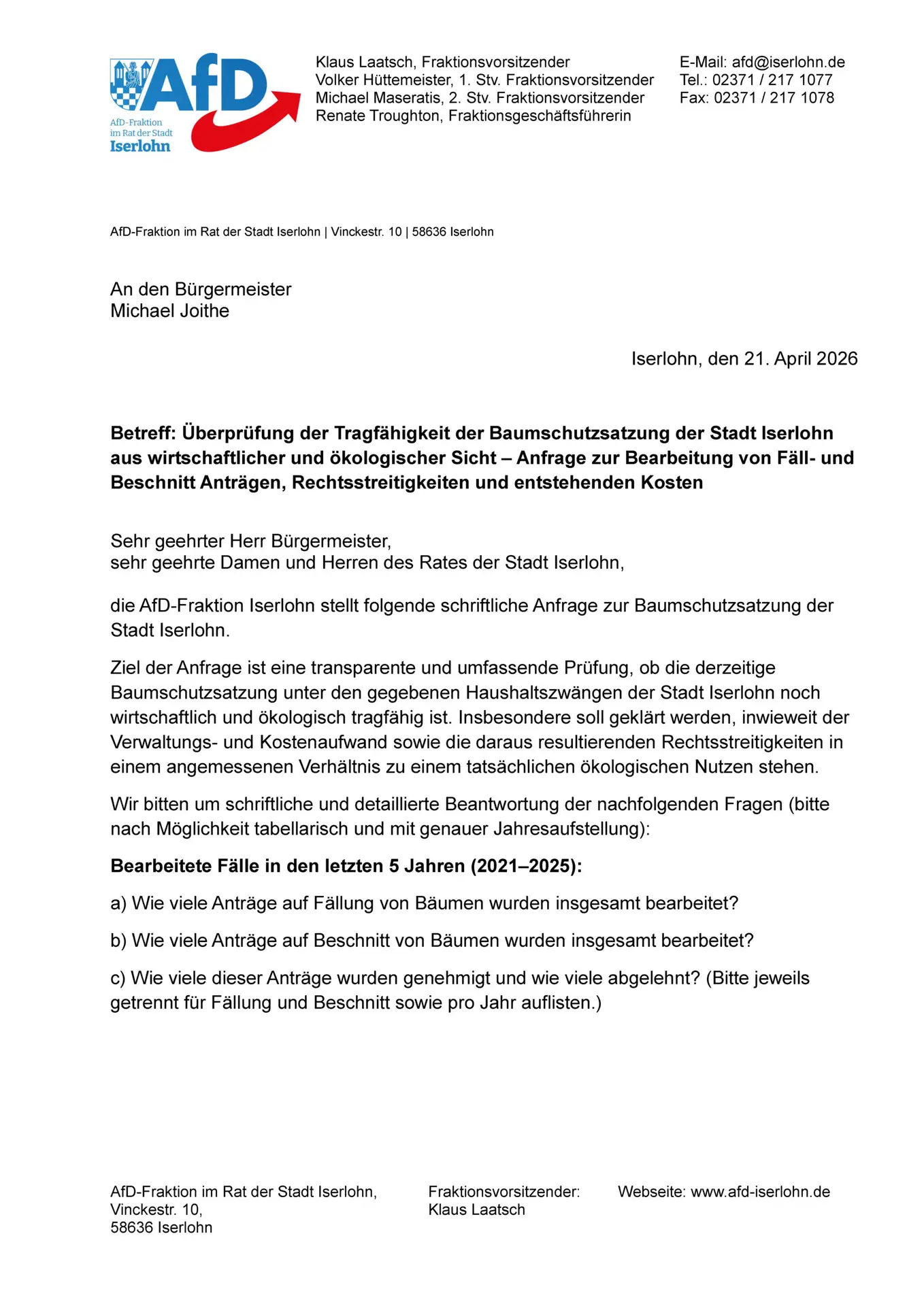 Wir veranlassen eine umfassende Prüfung der Baumschutzsatzung auf ihre wirtschaftliche und ökologische Tragfähigkeit, um das Verhältnis zwischen Verwaltungsaufwand und tatsächlichem Nutzen zu klären. Dafür fragen wir die genauen Fallzahlen zu Fäll- und Beschnittanträgen der letzten fünf Jahre sowie die vollständigen Personal- und Gerichtskosten des Zeitraums von 2016 bis 2025 ab. Wir setzen uns für eine haushaltsschonende Politik ein und erwarten Transparenz über die durchschnittlichen Kosten pro Rechtsstreit, um die Verhältnismäßigkeit dieser Regelung objektiv bewerten zu können.