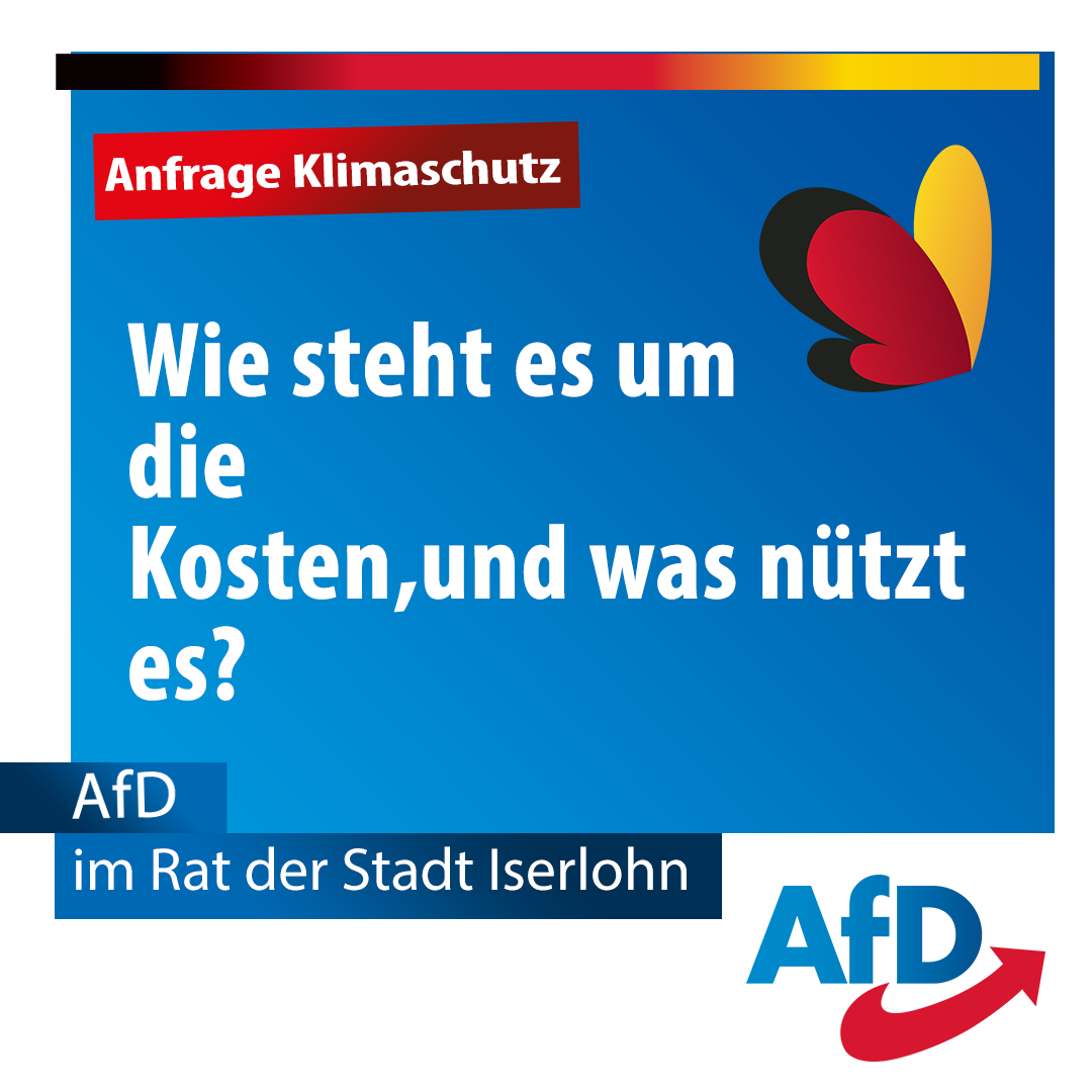 Anfrage der AfD-Fraktion zum Thema: Klimaschutzmaßnahmen Kosten und Nutzen der kommunalen „Klimaschutzmaßnahmen“ in Iserlohn I. Ausgangslage/ Vorbemerkungen: Selbst der IPCC (sogenannter „Weltklimarat“) stimmt der Aussage zu, dass 95 Prozent der CO2- Emissionen auf der Welt natürlichen Ursprungs sind und lediglich 5 Prozent der CO2- Emissionen auf einen menschlichen Beitrag zurückgehen.1 Die Hauptquellen der 95 Prozent [...]