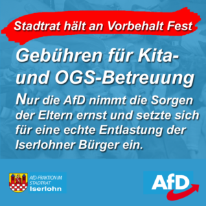 Beide Anträge, die eine Aussetzung der Kita- und OGS-Beiträge zu 100% bis zur Normalisierung des Schulbetriebs forderten, wurden von allen anderen Parteien abgelehnt. Nur die AfD nimmt das Leid der Eltern ernst und setzte sich dementsprechend für eine echte Entlastung der Iserlohner Bürger ein.